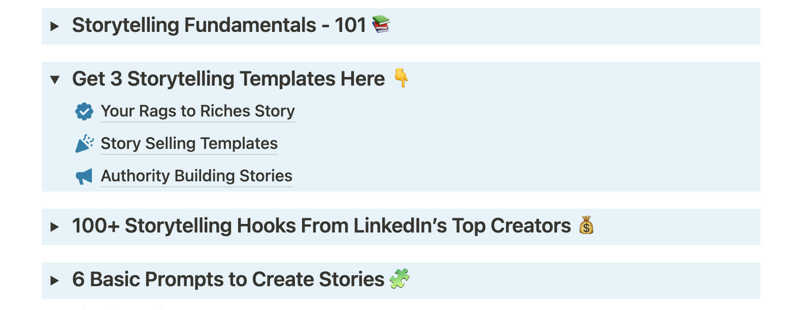 Join 550+ others and get your storytelling Notion template.With everything from the fundamentals of storytelling to high-performing templates, 100+ hooks, how to sell through stories, get leads through it, and more.